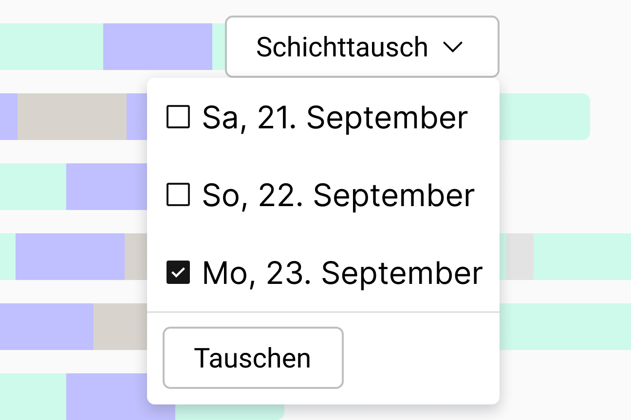 Bieten Sie Ihren Mitarbeitern die Möglichkeit, Schichten mit anderen zu tauschen, die die gleichen Qualifikationen, Verfügbarkeiten und vertraglichen Arbeitszeiten haben.