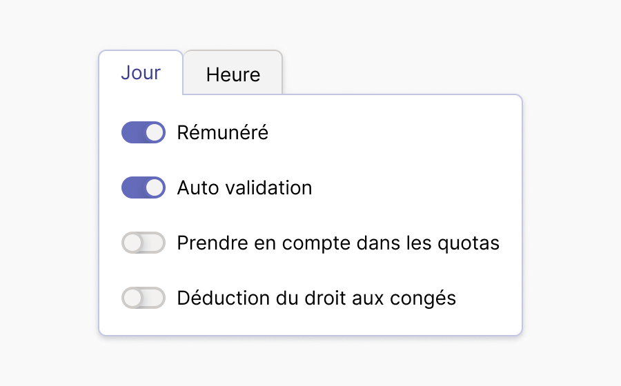 Créez tout type d’absence en fonction des besoins de votre organisation et des lois locales. Définissez si elle est demandable, rémunérée, calculée en heures ou en jours, et précisez son affichage dans le planning.