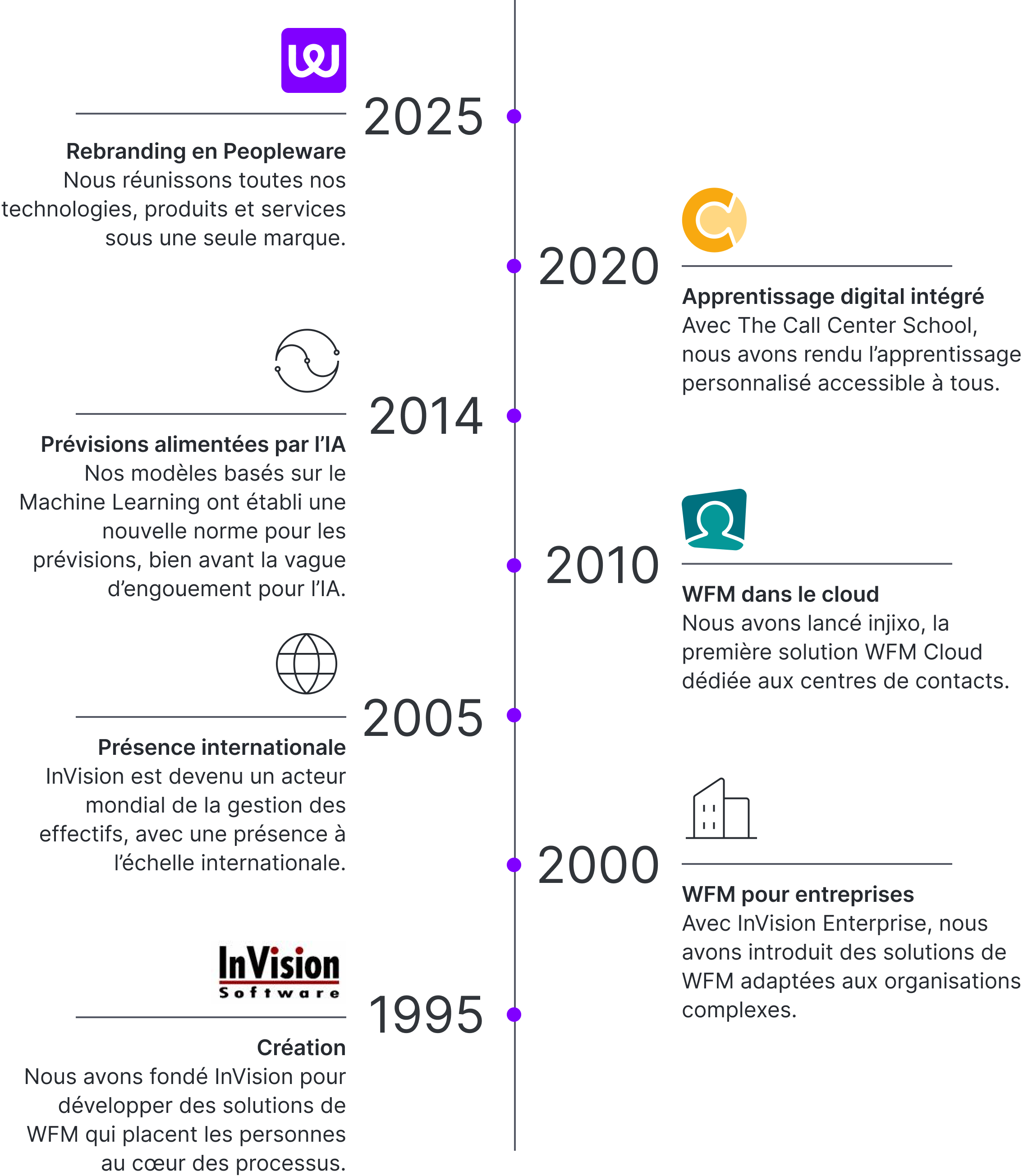 Depuis plus de 30 ans, nous façonnons l’avenir du WFM. Nous ne suivons pas les tendances éphémères : nous créons des solutions qui transforment profondément le travail. Permettre aux employés de participer activement à la planification et révolutionner les prévisions grâce au Machine Learning étaient autrefois des idées visionnaires. Elles sont désormais des références dans notre secteur.