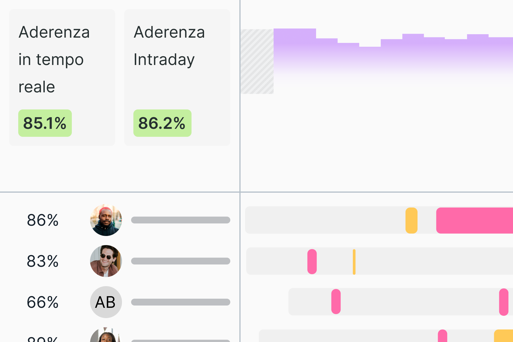 Analizza i dati sull'aderenza all'orario e alle attività dei dipendenti e dei team negli ultimi sei mesi.